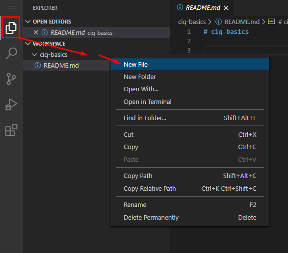 In Explorer, right click the ciq-basics folder and select New File: