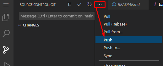 Now, we instruct VSCode to push the changes by clicking more actions and Push or the sync button at the bottom:
