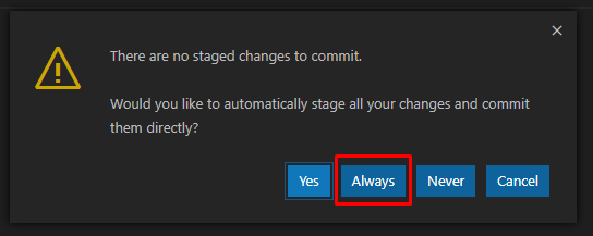 A message will pop up about staged changes. To save ourselves time in the future, click Always: