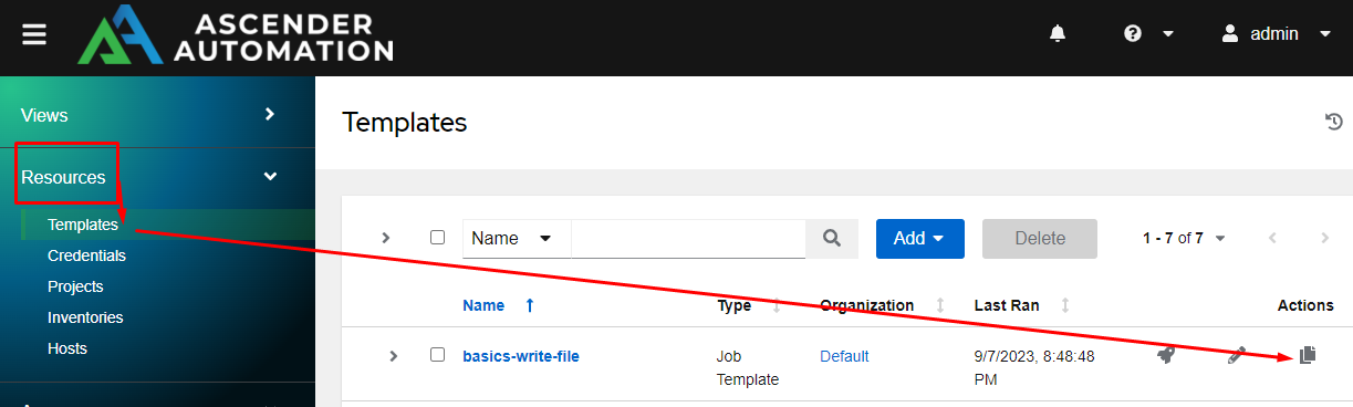 From the Resources menu, click Templates, then click the copy button: