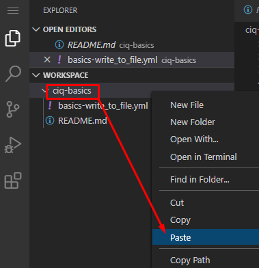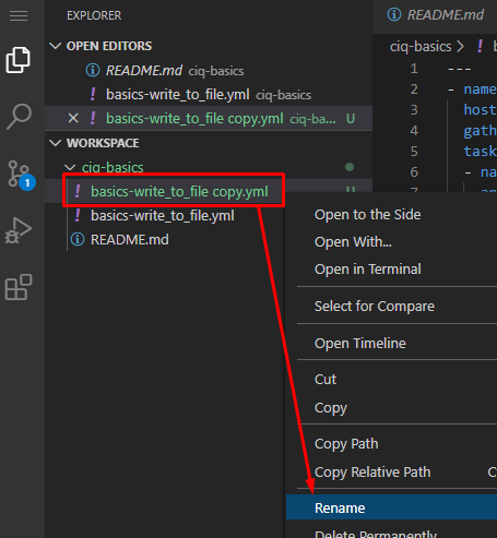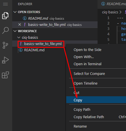 Let’s practice by duplicating, then modifying our existing playbook basics-write_to_file.yml. I’ll make a copy and name it basics-write_to_file_vars.yml. I’m going to do this in VSCode by right clicking the basics-write_to_file.yml file and choosing copy, then right click ciq-basics folder and choose paste: