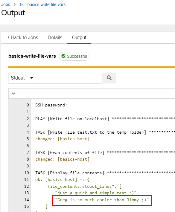 var: file_contents.stdout_linesNotice the “line” key / value pair. Here I’m doing variable replacement. Variables will be used most often in the format shown here. It will be double curly braces with the variable name inside and surrounded by double quotes: “{{ variable_name }}”.