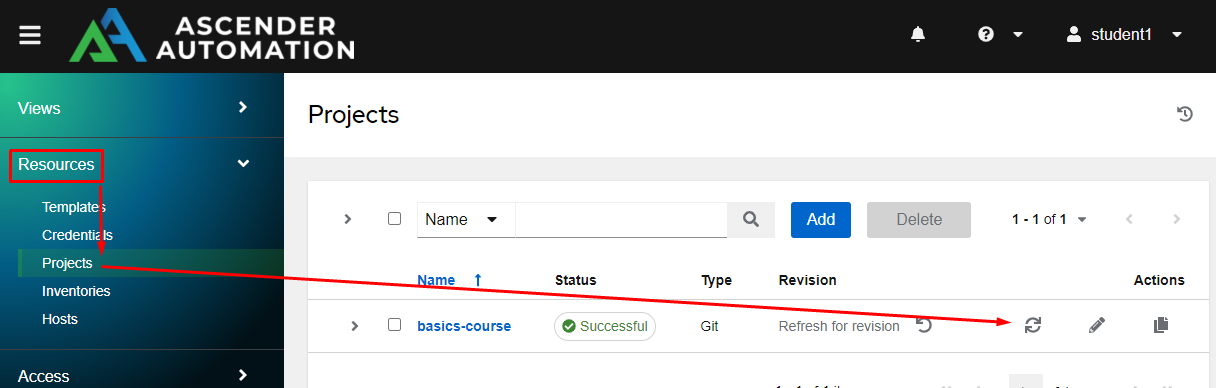 Now that I’ve saved the new file in my git repository I’ll resync the project in Ascender so that it will show up as a usable playbook. From the Resources menu, click on Projects, then the sync symbol next to my basics-course project. I have to do this right after the file is created because nothing has forced the project to pull in this new playbook yet: