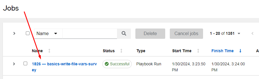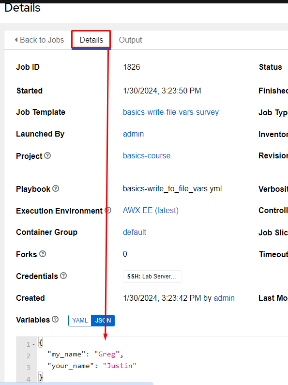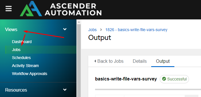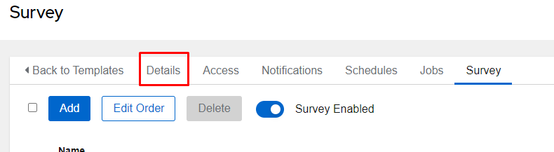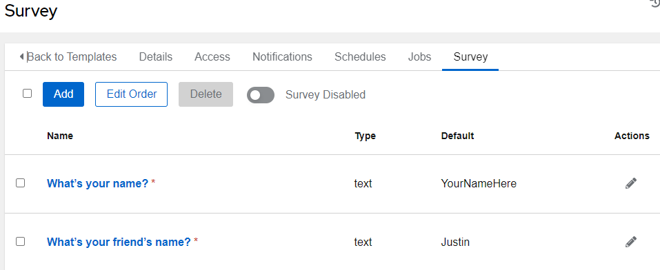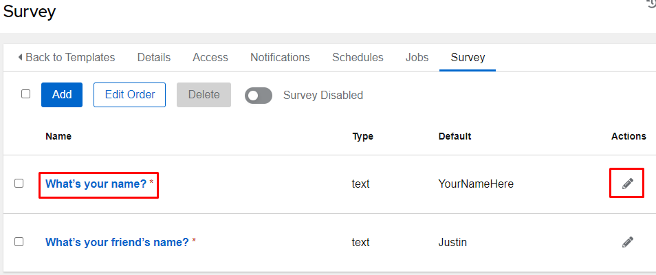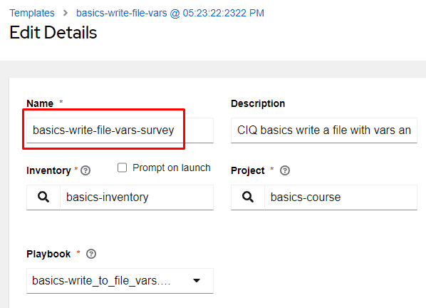 Once the job template has been cloned, I’ll edit the name to basics-write-file-vars-survey:
