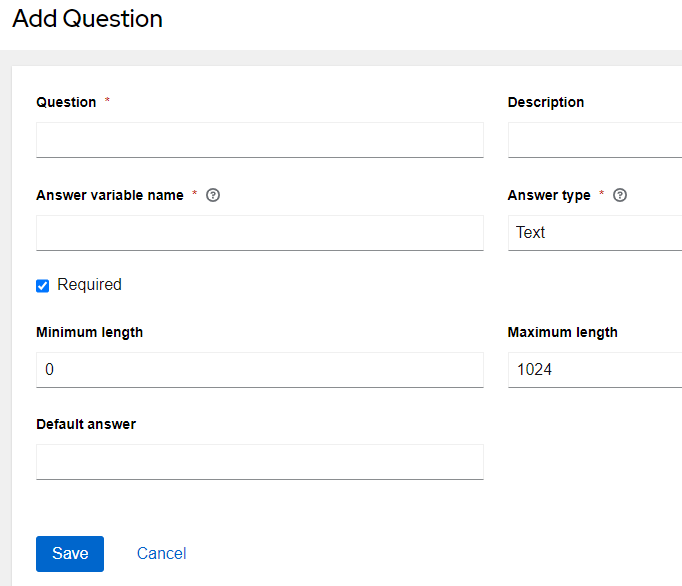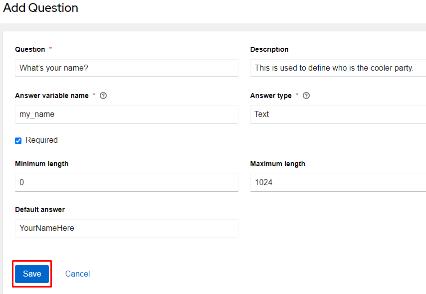 At this point I’ll add my first entry. I’m going to ask the user what their name is. Keeping this in mind I’ll use the info from the below to fill in the blanks and click Save. Remember, only the answer variable name must be exactly as below: