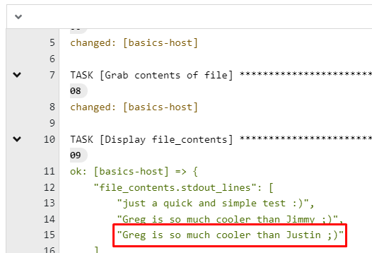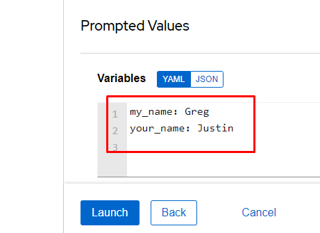 We are simply going to reuse (you don’t need to create anything in VSCode) the basics-write_to_file_vars.yml playbook from section 1.5. Just as a reminder, it’s listed below. The blue sections show that we are setting the my_name and your_name variables in the playbook, and we won’t be changing this in the playbook itself. Rather we will be using a survey to overwrite these variables(since a survey passes values in as extra_vars, they will have the highest precedence). Keep in mind that the green line is where we actually utilize those variables.