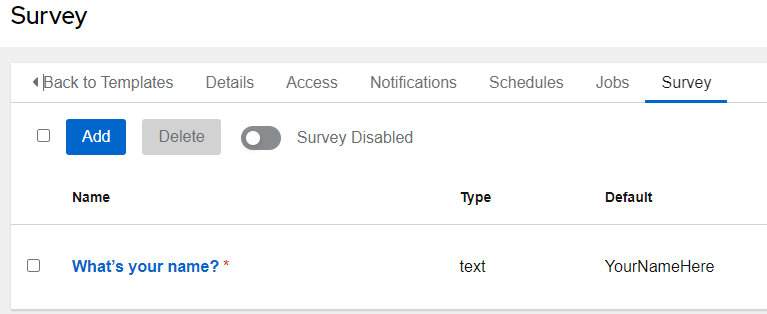 We are going to be quickly revisiting the variables lesson to examine surveys. Surveys are a simple way to prompt a user for all kinds of various information to be used in a job template. The information is simply injected into the playbook as extra variables(with extra_vars having the highest level of precedence they will overwrite any existing variables with the same name).