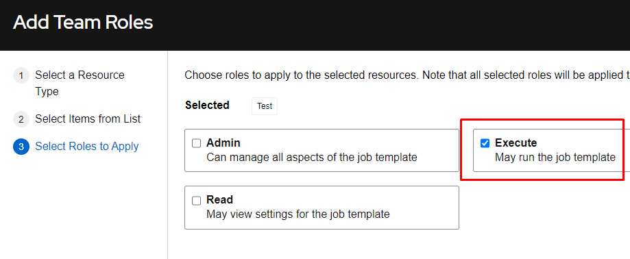 I’ll now select the Execute role and click Save. Again, this will allow the members of the Test group execute only permissions on this job template (no modification or viewing is possible):