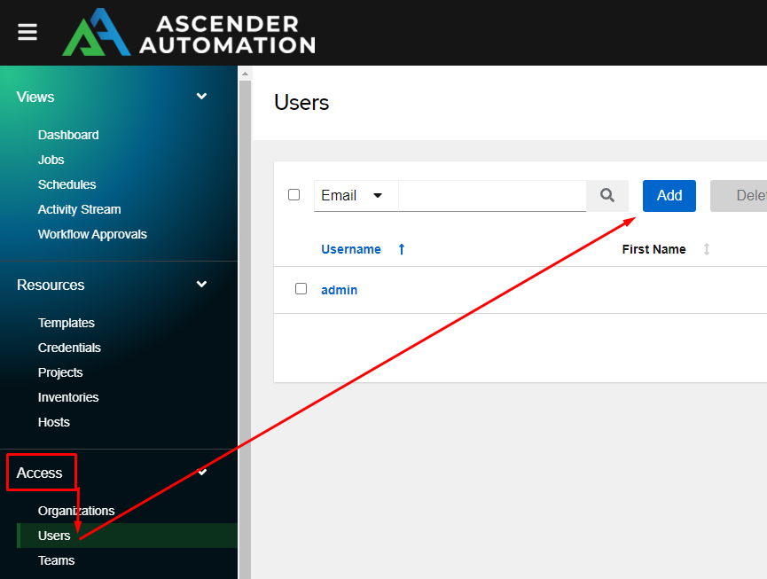 Let’s create a user by going to the Access menu, clicking Users, then click Add: