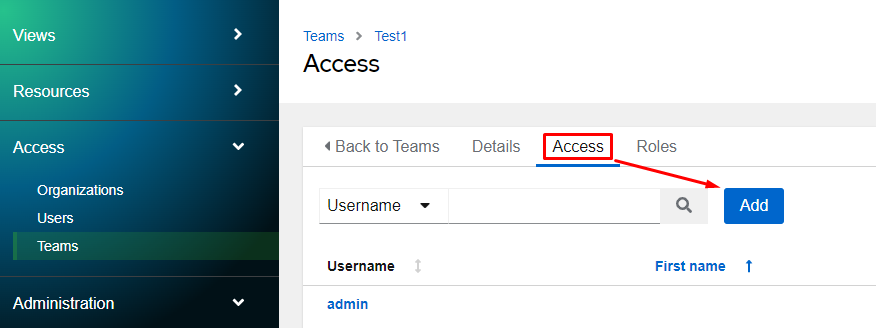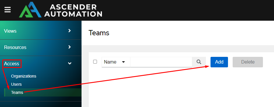 Begin adding a team by clicking on the Access menu, choosing Teams, and clicking Add: