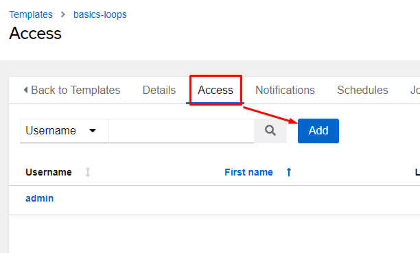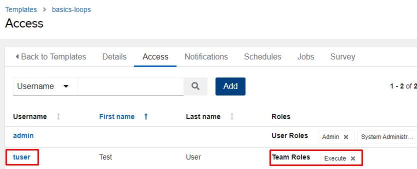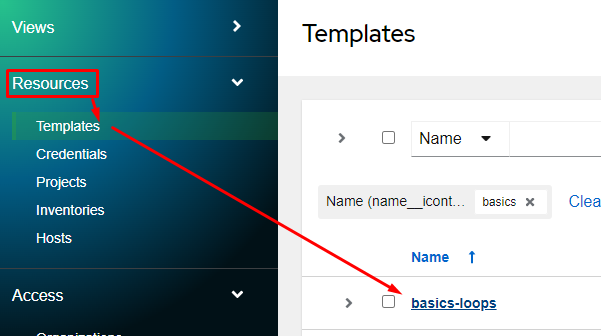 In this example, we’ll give the tuser account execute permissions only on the basics-loops job template. I’ll start by entering the job template with Resources, Templates, click on basics-loops: